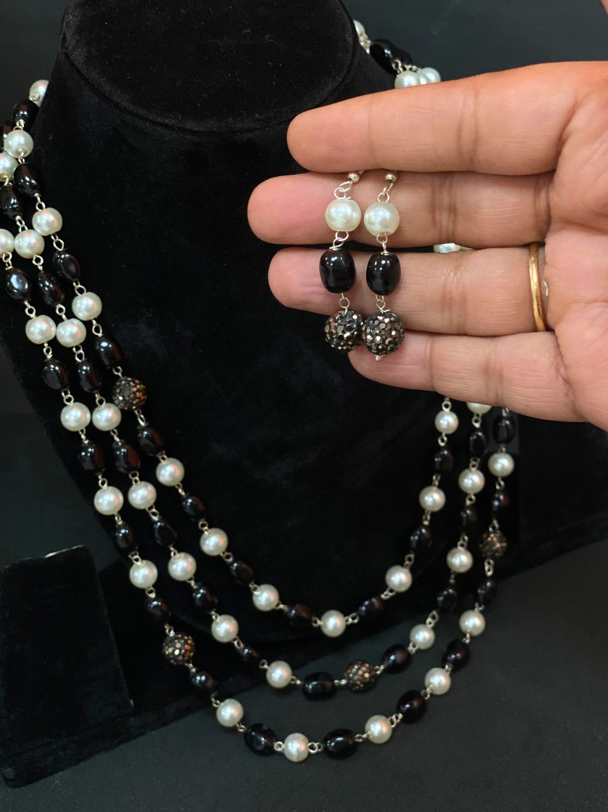 • Classic black beads paired with pearl accents