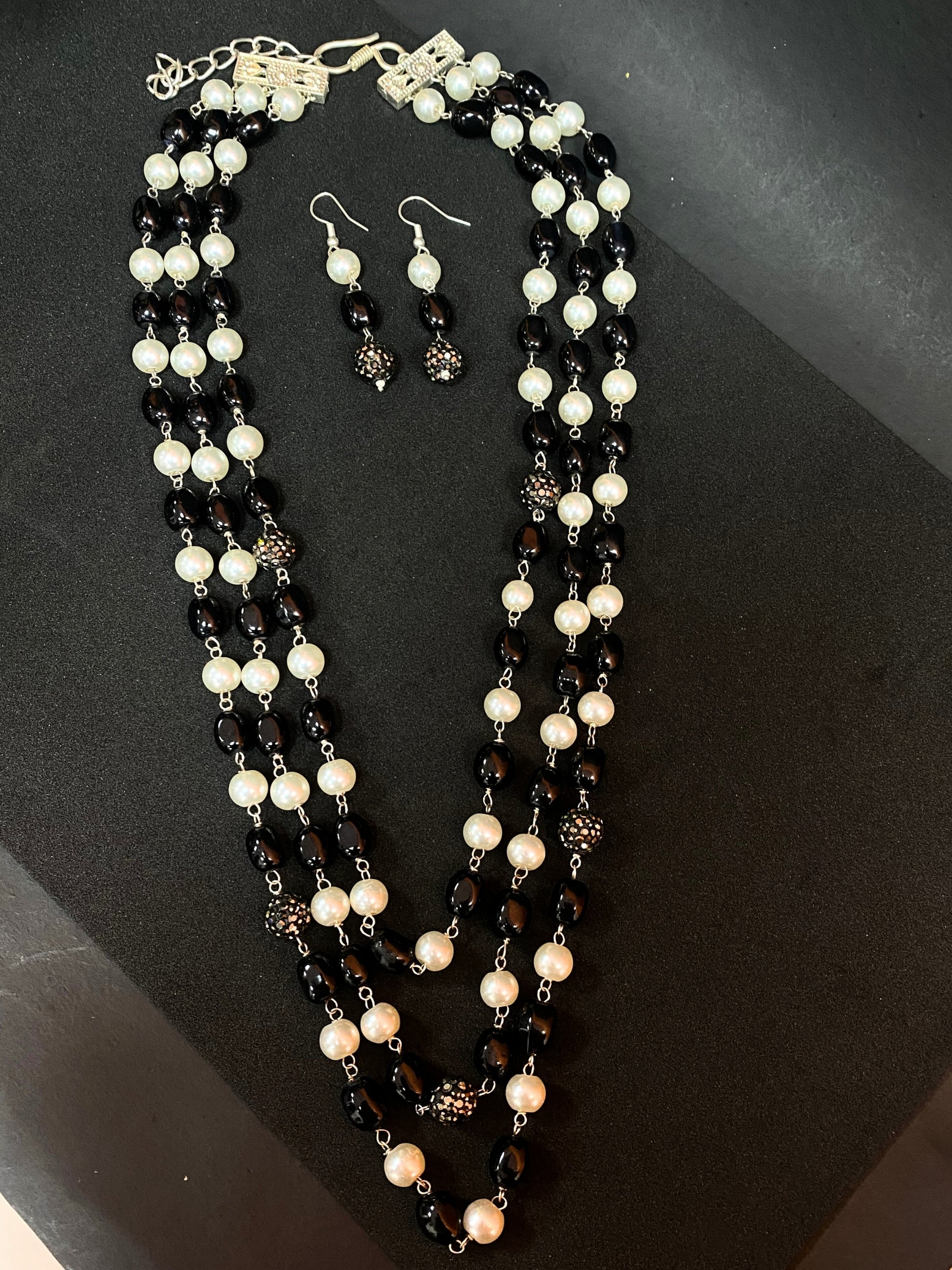 Enhance your ethnic and Indo-western style with this elegant Black & Pearl Multi Layer Beaded Necklace Set. Crafted with a beautiful combination of classic pearl beads and glossy black beads, this long necklace adds sophistication and charm to any outfit. The layered design creates a statement look, while the matching earrings complete the set perfectly. Lightweight yet eye-catching, this jewellery set is suitable for festive occasions, weddings, parties, and evening wear. A must-have accessory for women who love timeless fashion.
