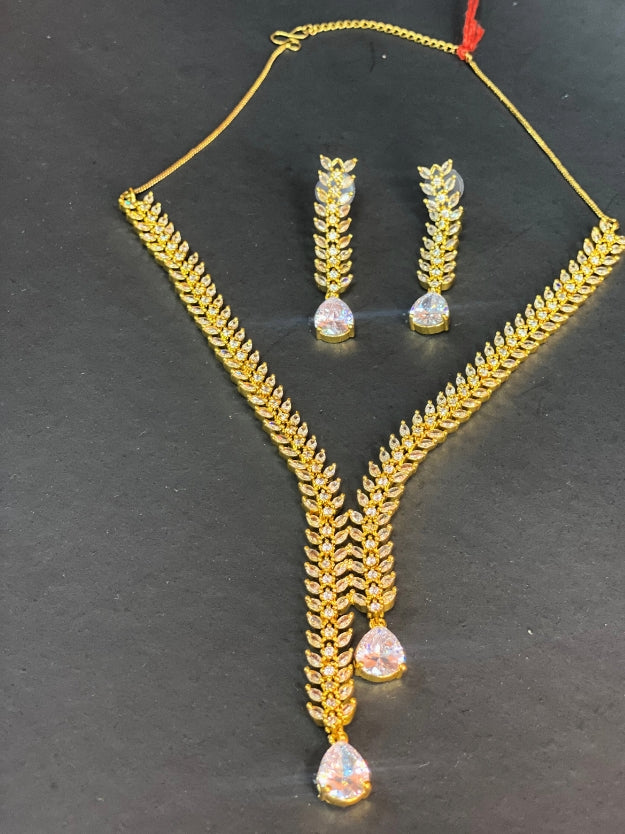 Dazzling American Diamond (AD) Leaf Design Necklace Set Step out in style with this elegant and modern gold-plated jewelry set. Its unique wheat sheaf/leaf motif and brilliant sparkling stones make it a perfect accessory for any formal or semi-formal event.