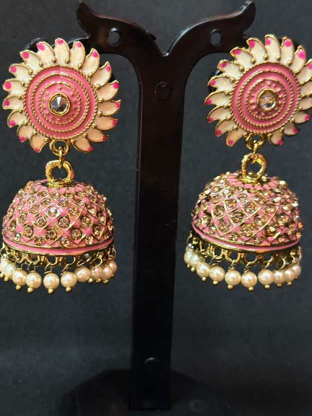 Design: Classic Jhumka style with a beautiful circular stud/post top featuring Meenakari (hand-painted enamel work) in shades of pink and off-white/cream.
