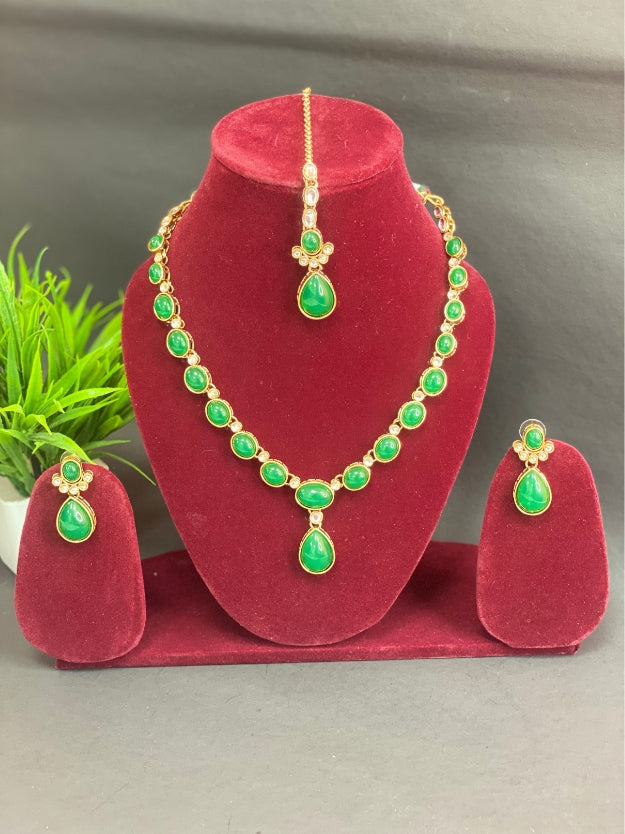 Elegant Green Stone Necklace, Earrings & Maang Tikka Jewellery Set