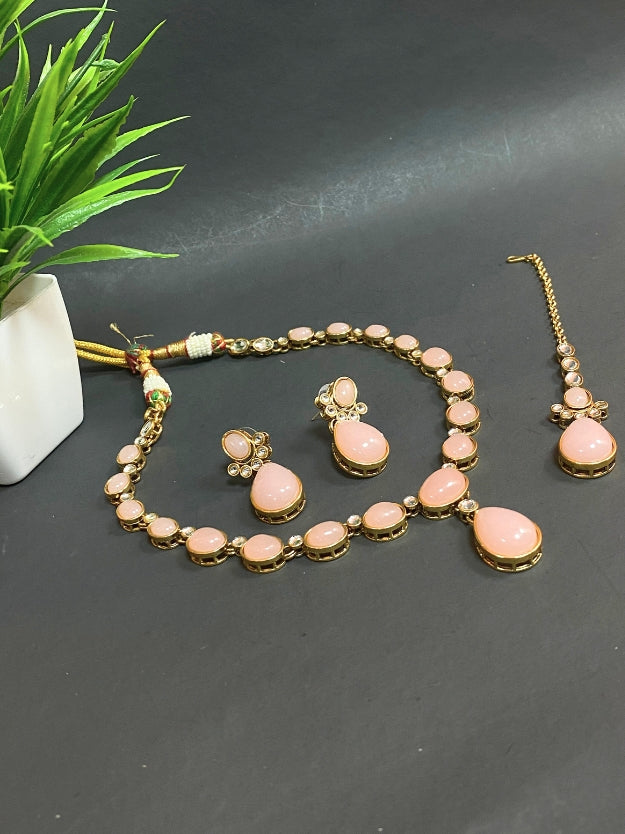 Give your festive and party looks a soft, classy glow with this beautiful Pink Stone Gold-Plated Jewellery Set. Designed with premium oval and teardrop pink stones, delicate gold detailing, and a modern-yet-ethnic finish, this set is perfect for weddings, engagements, parties, and all traditional occasions. The set includes a matching necklace, earrings, and maang tikka, all lightweight and comfortable for all-day wear. Its pastel pink color makes it ideal for lehengas, gowns, shararas, and sarees.