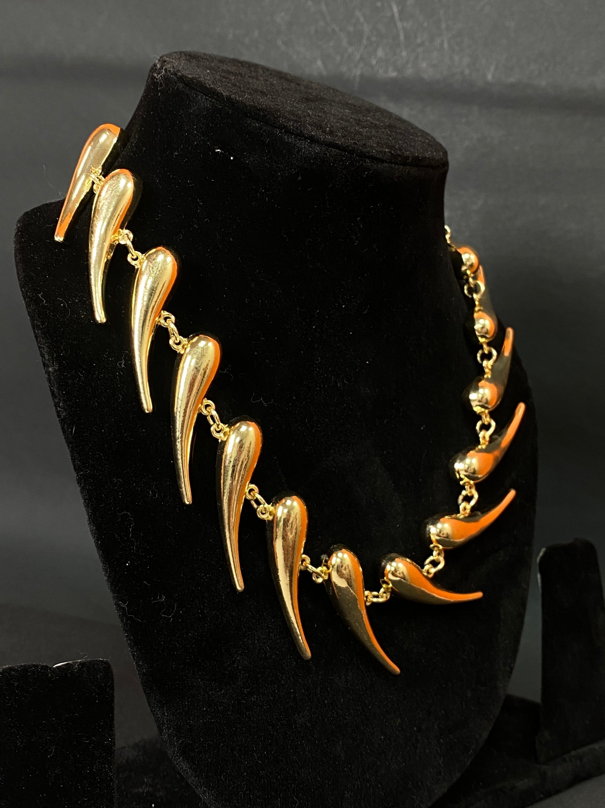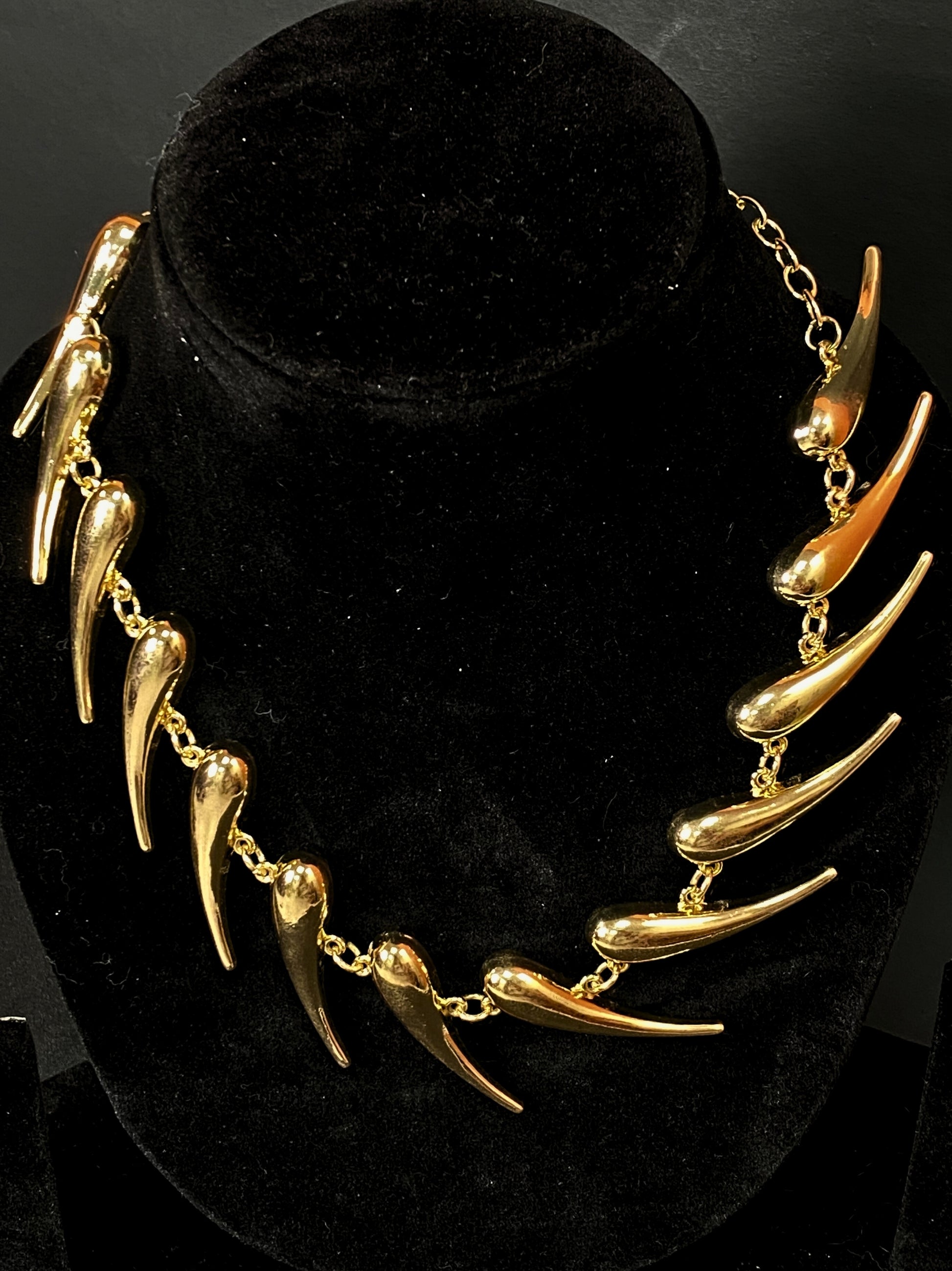 Make a bold style statement with this Gold Plated Curved Spike Necklace. Designed for modern fashion lovers, this necklace features sleek, tusk-inspired elements linked together in a striking chain pattern. The polished gold-tone finish enhances its contemporary appeal, making it perfect for pairing with dresses, tops, gowns, and chic evening outfits. Whether for a party or a special night out, this necklace adds confidence and edge to your look.
