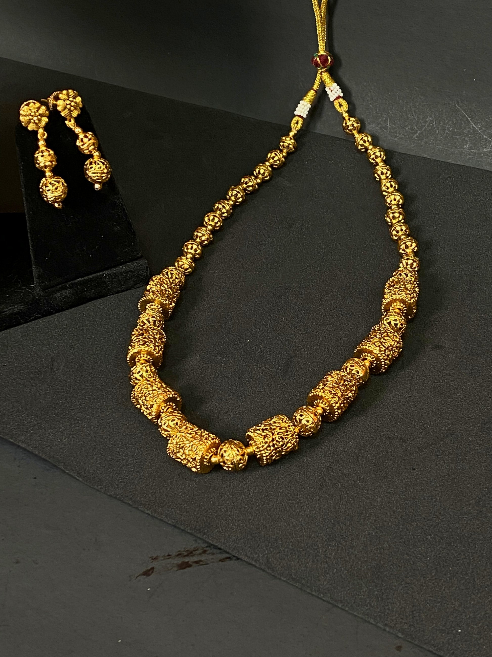 Enhance your traditional jewellery collection with this elegant Gold Plated Beaded Necklace Set. Crafted with beautifully textured gold-tone beads, this necklace reflects classic Indian craftsmanship and timeless design. Paired with matching earrings, this set is perfect for weddings, festivals, poojas, and special occasions. Whether worn with a saree or a traditional ensemble, this jewellery set adds richness and sophistication to your look.