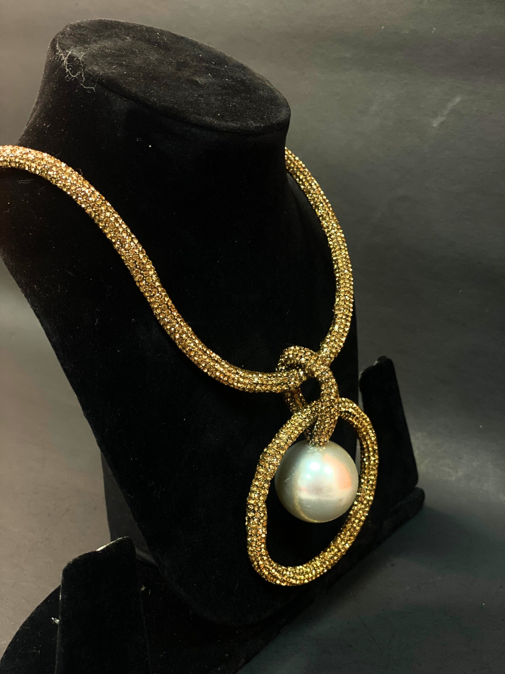 Grand Circle Pearl Pendant – Gold Crystal Mesh Statement Necklace