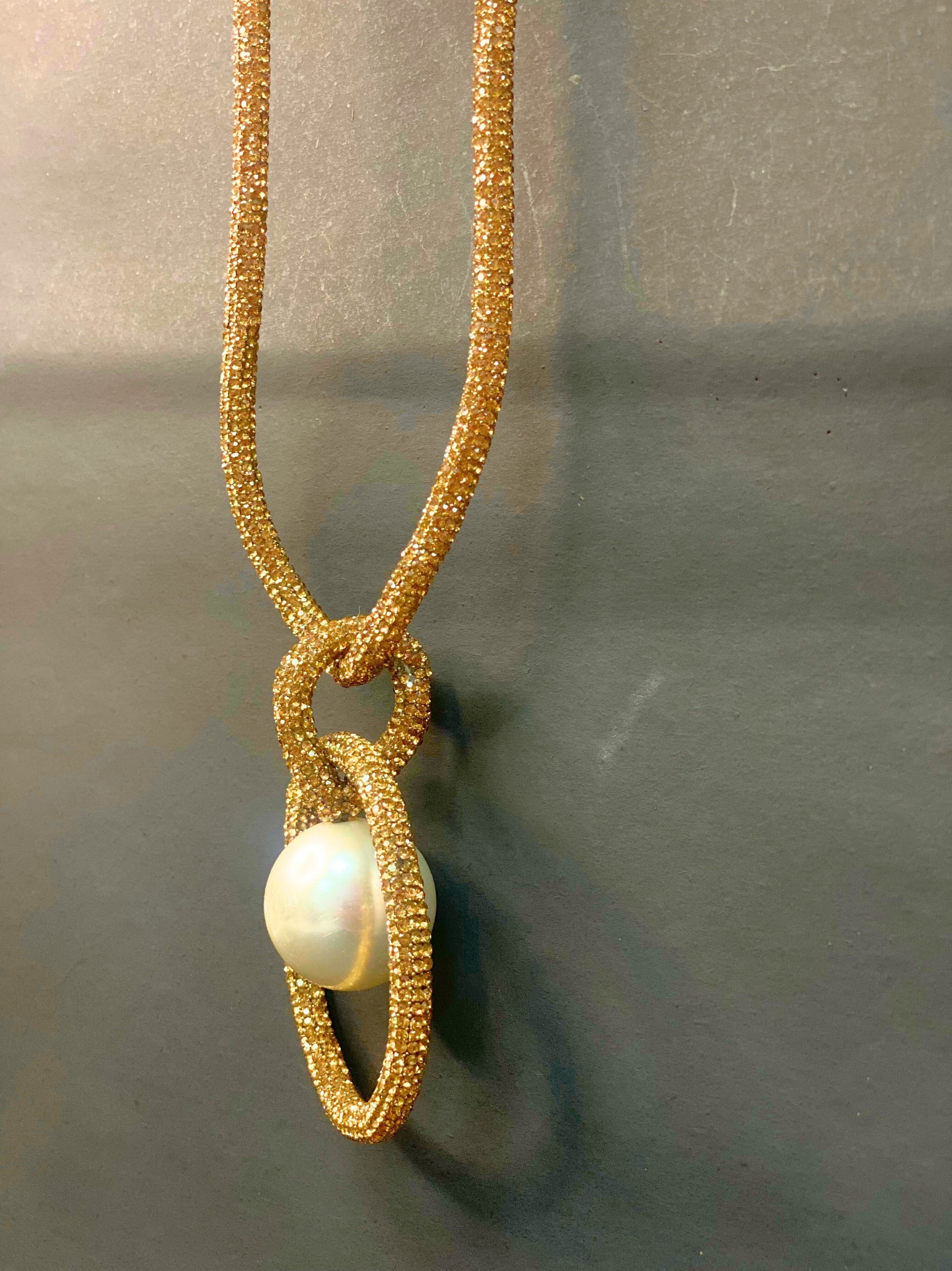 Elevate your jewelry collection with the Grand Circle Pendant. This bold accessory reimagines the classic pearl necklace for the modern woman. Utilizing a shimmering gold-tone micro-crystal mesh, the necklace provides a unique texture that sparkles with every movement. The focal point—a dramatic geometric ring surrounding a high-luster cream pearl—creates a powerful silhouette. Pair it with a simple cocktail dress or a sharp blazer to let the craftsmanship take center stage.