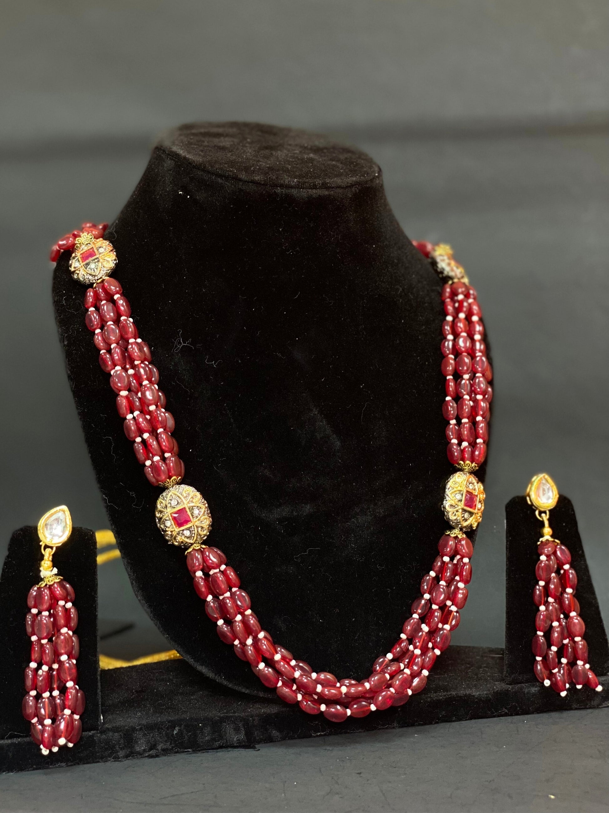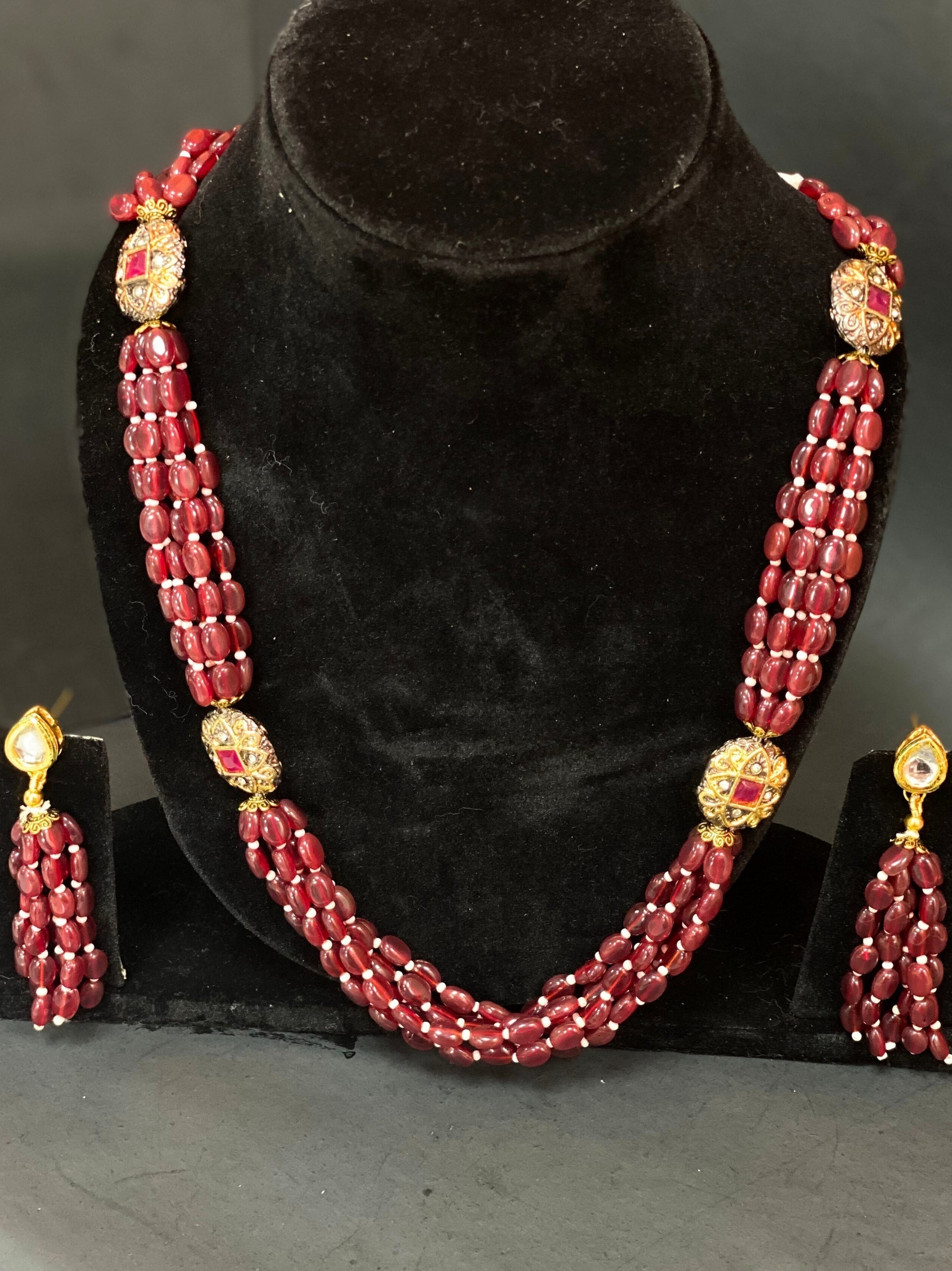 Maroon Beaded Multi Strand Long Necklace Set with Kundan Work & Matching Earrings