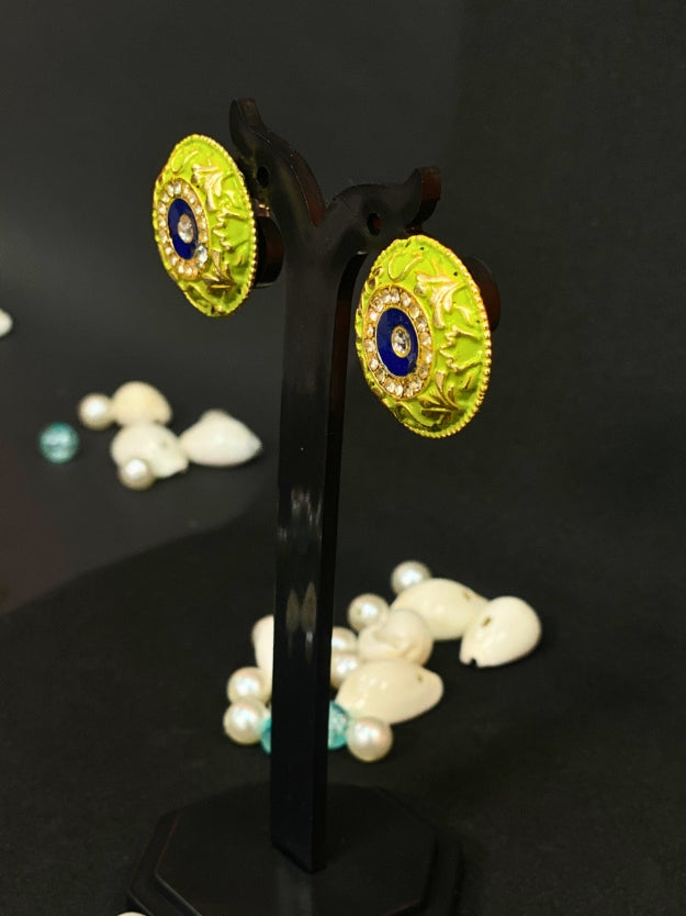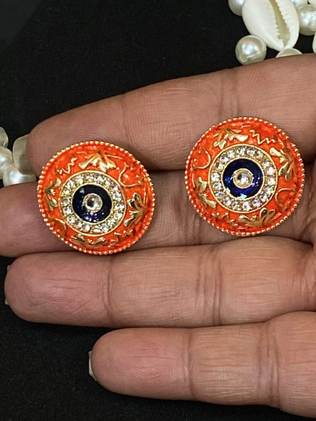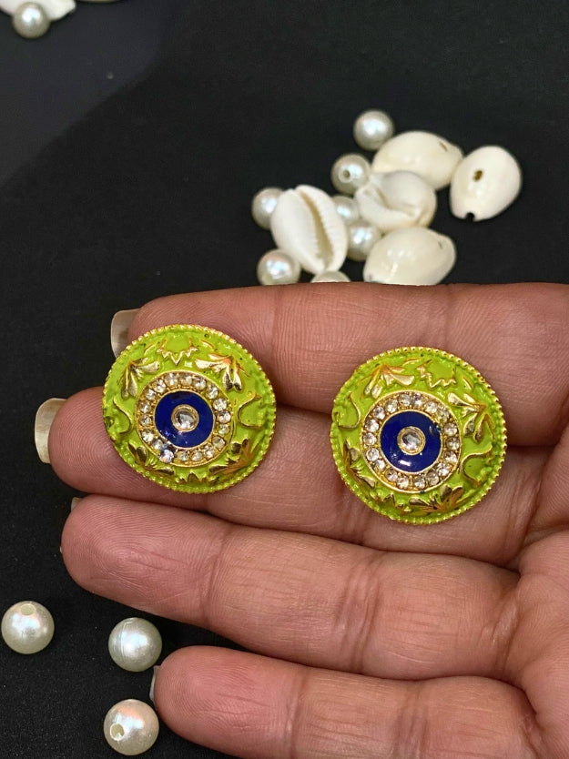 Elevate your ethnic style with these exquisite meenakari round stud earrings featuring stunning Imitation stone work. These beautiful earrings showcase intricate traditional craftsmanship with a modern touch, perfect for adding a pop of color to any outfit!