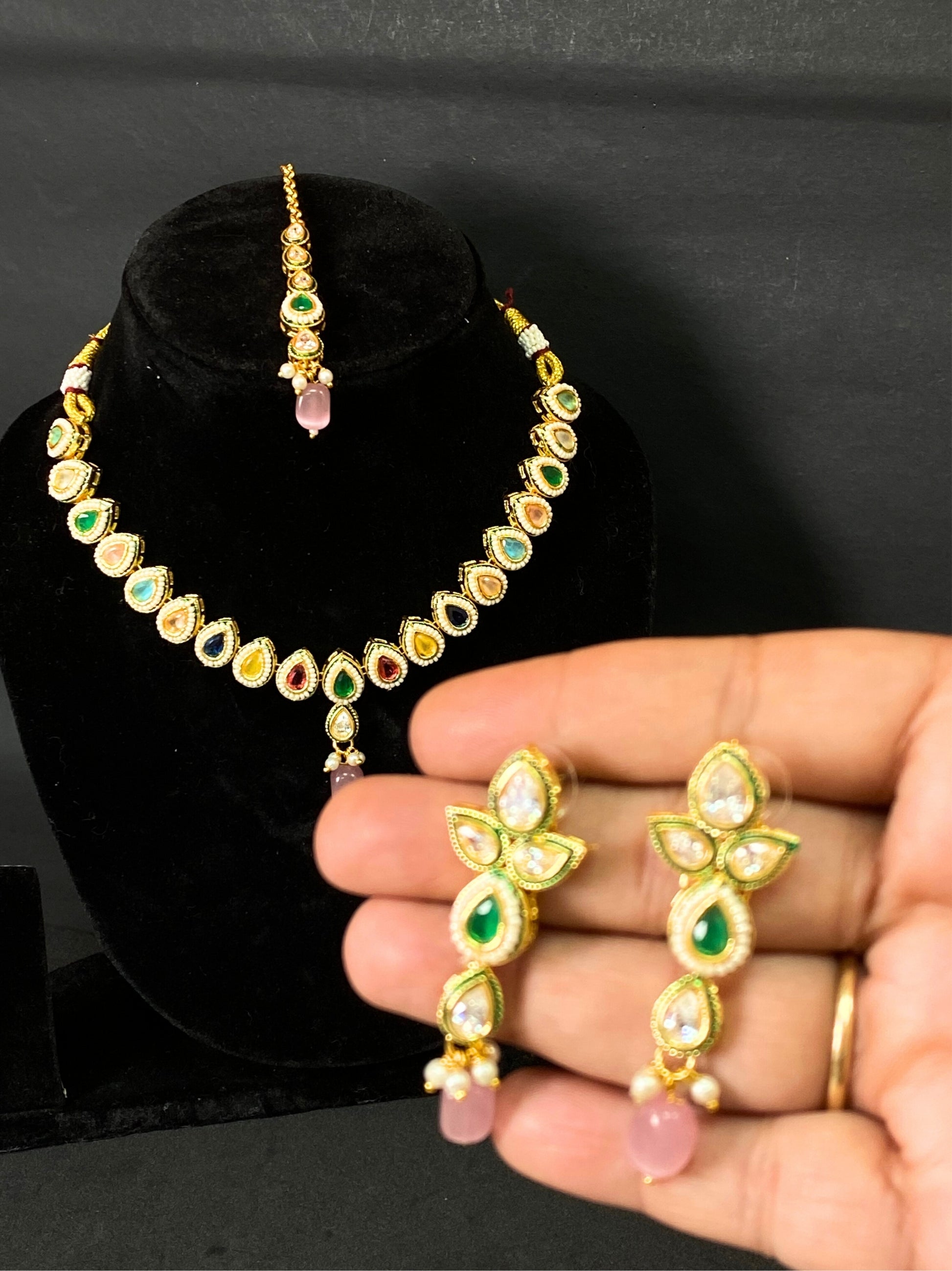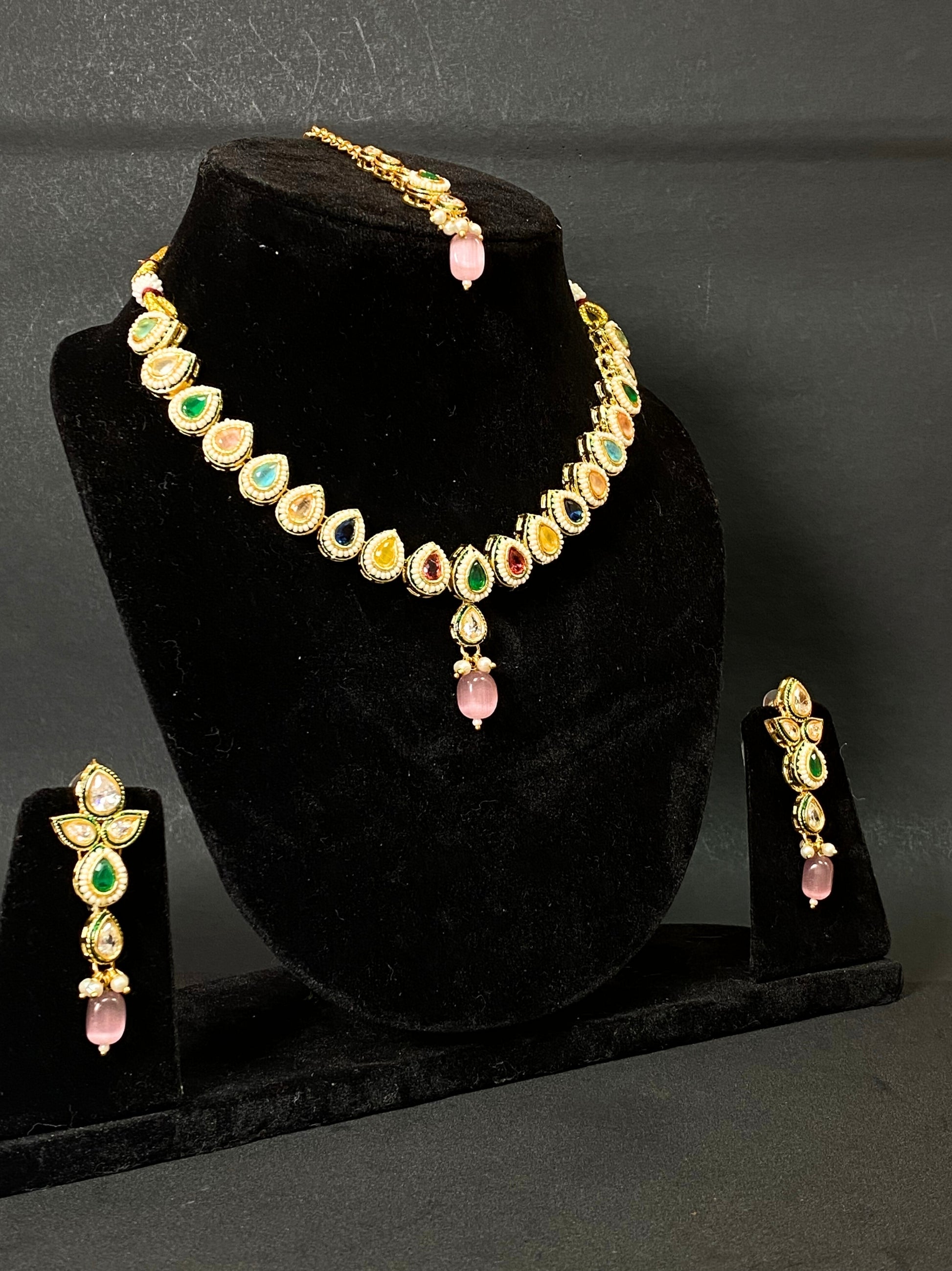Multicolor Kundan Necklace Set with Pink Drop Pendant, Earrings & Maang Tikka