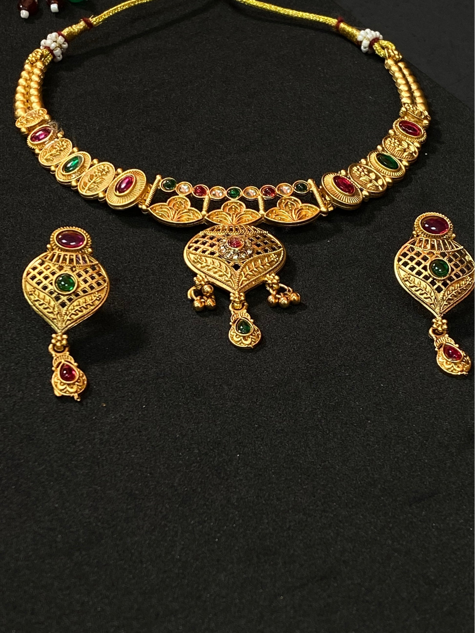 Bring home timeless elegance with this Gold Plated Traditional Necklace Set, designed to reflect classic Indian craftsmanship. The necklace features detailed gold-tone elements with a beautifully carved pendant highlighted by green and red stones, giving it a royal and graceful appeal. Paired with matching earrings, this jewellery set complements sarees, silk outfits, and ethnic ensembles effortlessly. A perfect choice for weddings, festive celebrations, and traditional occasions where elegance matters.