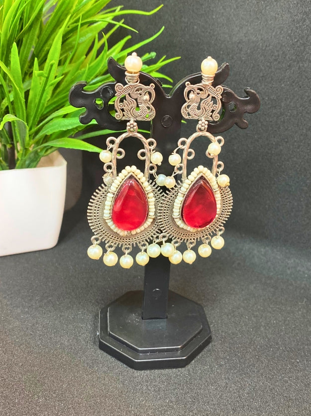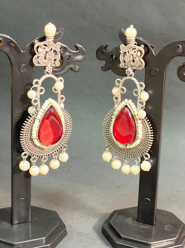 Traditional Oxidised Silver Red Tear-Drop Stone Dangler Earrings with Pearl Hangings
