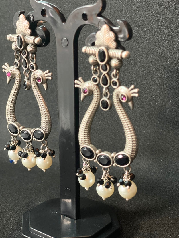 Trendy Oxidised Silver Peacock-Design Earrings with Black Stones & Pearl Beads